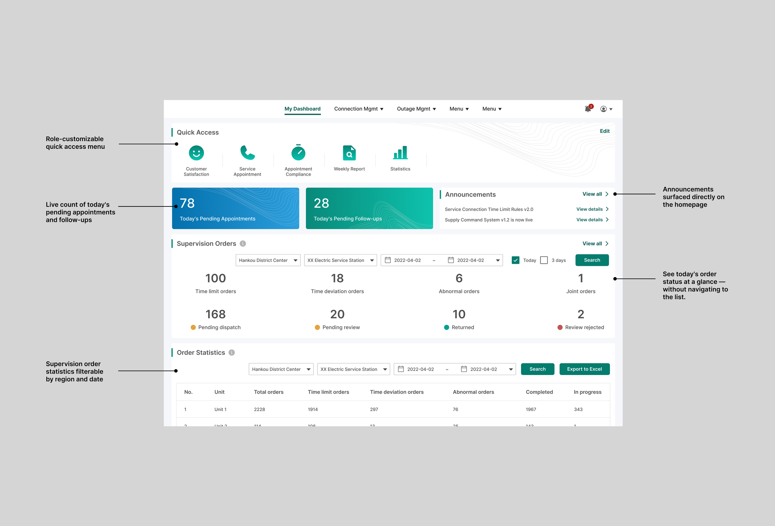The old system buried everything. There was no overview of today's workload, announcements were hidden deep in navigation, and every user saw the same generic homepage regardless of their role.