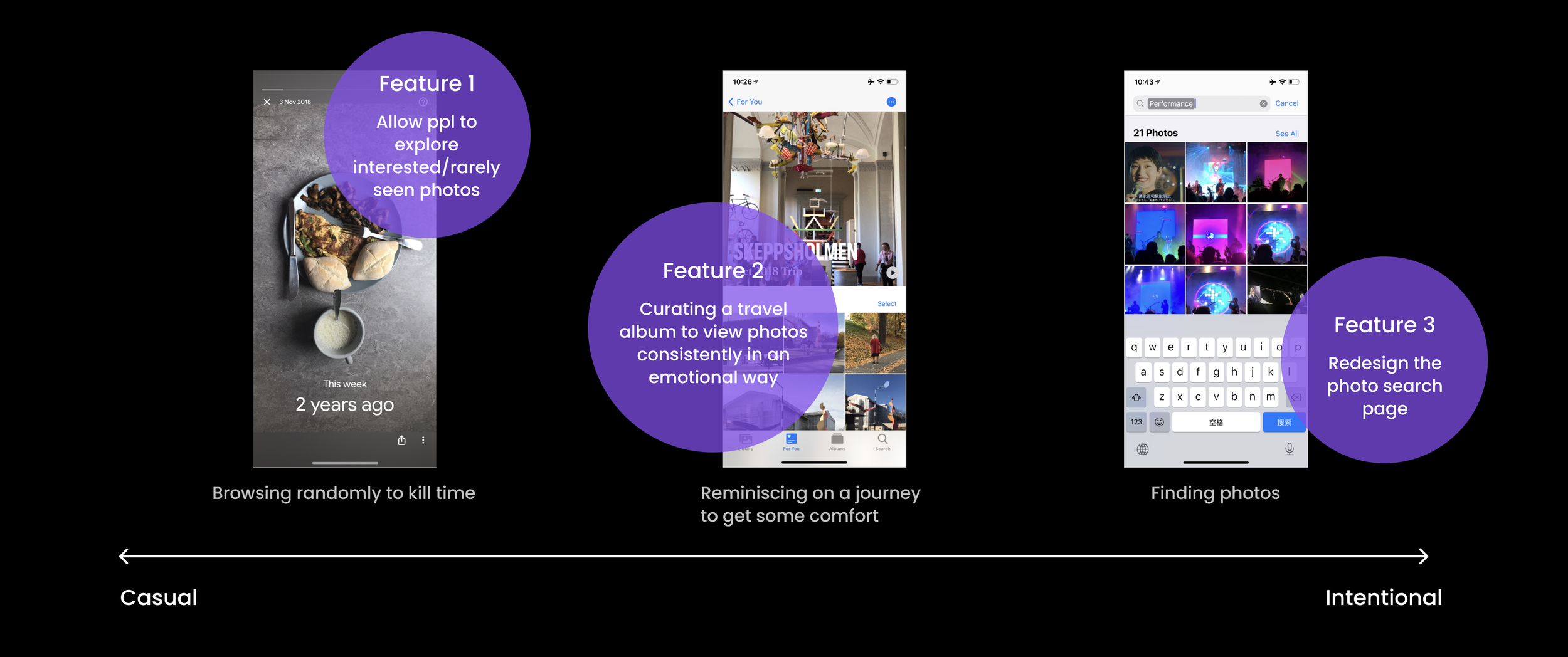 The outcome was a set of proposed features for the iOS Photos app that enhance AI capabilities while incorporating lightweight user input, demonstrated across three different user scenarios.